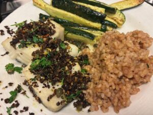 Speaking of filling and satisfying meals (and why not fun and easy, too) here’s what came together for me recently: Leftover brown rice fried in coconut oil, roasted zucchini spears and baked white fish. If you have time, a crumb topping adds a special touch.