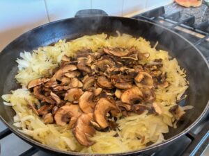 Reduce heat to medium-low. Push onion and mushrooms to sides of pan and pour oil into center. Once warmed stir in herbs and cook a couple minutes until herbs are fragrant. Then stir into onion and mushroom and continue cooking another five minutes for flavors to meld.