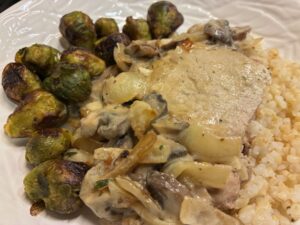 On night two I served over a pork chop with brown rice and roasted Brussels sprouts