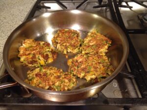 Add oil to the same pan used to saute onions and heat over medium heat. When warm, form salmon mixture into 5-6 small patties and lay in saute pan. Brown patties about 3-4 minutes, then reduce heat to medium-low, flip patties, and cook another 3-4 minutes until cooked through.