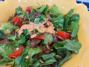Lettuce is a cool weather crop, so as the temps begin to drop, we’ll get some almost-sweet-tasting lettuce, but while it’s still warm enough for a salad to be appealing. These two salad combos are made even more interesting with the addition of a creamy Mexican salad dressing.