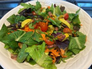 Lettuce ~ Shredded Carrots ~ Cherry Tomatoes (halved) ~ Red Cabbage (thinly sliced) ~ Yellow Squash (cubed and roasted) ~ Spicy Pumpkin Seeds ~ Green or Purple Peppers (diced to 1/2″) ~ Red Beans ~ Chopped Cilantro (as garnish)
