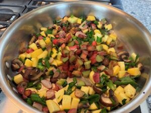 Just a reminder that it’s rhubarb season. Here I show it getting washed and dried along with a bunch cilantro (which pair nicely with each other, BTW.) Don’t miss out on the burst of sweet-tart flavor rhubarb adds to a dish. And remember that it can be used in savory dishes as well as sweet.